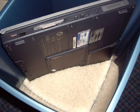 Me sugirieron sumergirlo en arroz, por lo que me fui al Tesco a comprar el bote más grande, a la vez que barato, de cualquier tipo de arroz. Finalmente compré 4 kilos de bashmati. Cuando vine, lo sumergí utilizando una papelera y tras unas horas comenzaba a dar sus frutos. Todo funcionaba excepto el ratón así que lo dejé toda la noche y esta mañana ya funcionaba todo perfectamente. ¡Qué susto!