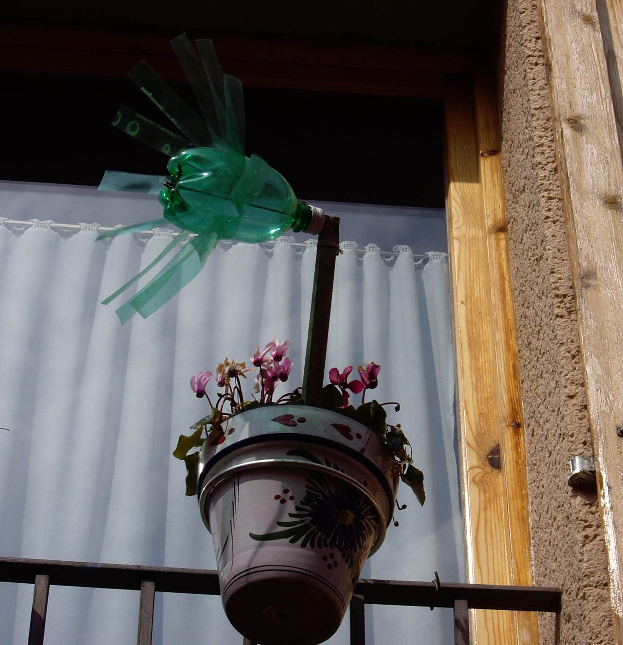 Yo creo que bien se puede utilizar como ahuyentador de aves, una función que puede hacer un espantapájaros en grandes extensiones, pero trasladado al nivel doméstico. La verdad es que no recuerdo haber visto aves como palomas o similar en ese pueblo, pero todo puede ser. También se me ha ocurrido la posibilidad de objeto decorador, pero lo he descartado inmediatamente.